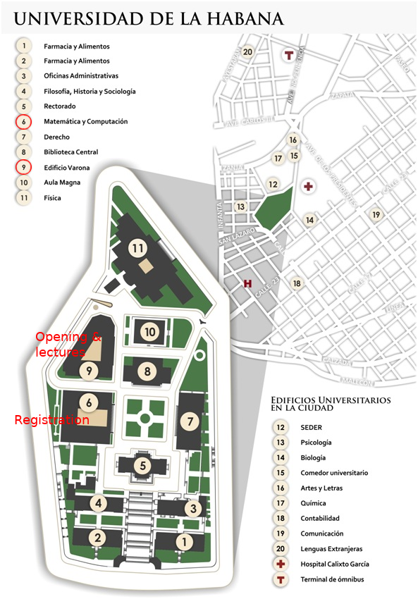 When arriving on Tuesday 11th, please go to the Faculty of Mathematics and Computer Science (building number 6 in the map below) in order to register and get your badge. Enter the faculty, walk on the right hall, the second door is the Department of Mathematics. There you will receive your badge. The opening is at 10:00 at Varona building (edificio Varona), number 9 in the map, first floor, room 290 (salón 290).